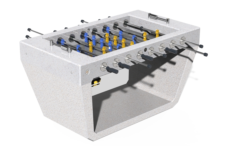 Il calciobalilla che proponiamo è un tavolo realizzato in un blocco unico di calcestruzzo, con robusti fianchi laterali che formano un tutt’uno con la base di appoggio e la struttura portante degli elementi di gioco. Si tratta di un tavolo massiccio del peso di 610 kg, ma la capacità di design e la versatilità del materiale consentono di conferire al manufatto una leggerezza estetica notevole. Il materiale costruttivo è calcestruzzo ad alte prestazioni HPC (High performance Concrete) con classe di resistenza C60/75. Il calcestruzzo è fibro-rinforzato e armato internamente con una struttura metallica.
