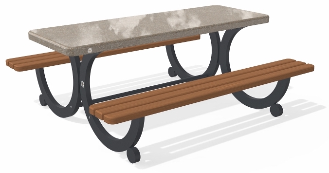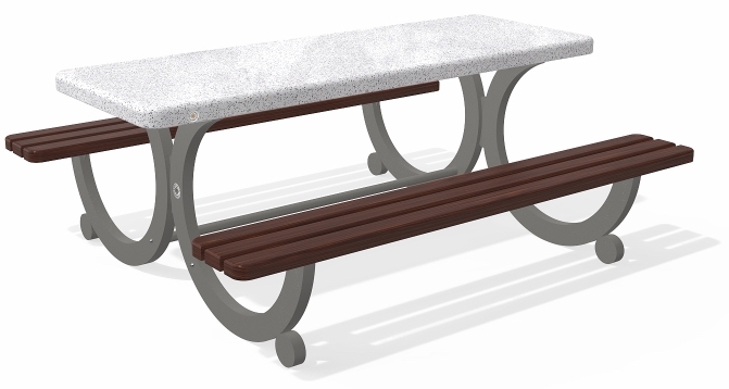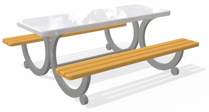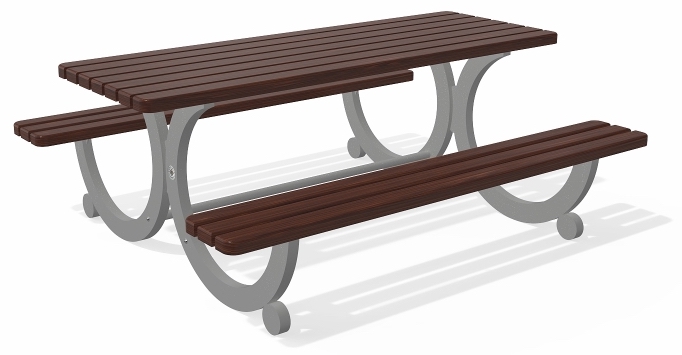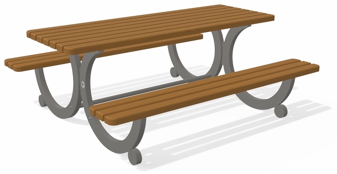 Gli elementi strutturali sono tutti in robusto acciaio zincato. Si tratta delle due spalle laterali e di quattro barre tonde che permettono di irrobustire l’intera struttura del tavolo: due sono posizionate in basso, ed assolvono anche la funzione di poggiapiedi, le altre due sono nascoste sotto il piano di appoggio. Come detto, le parti metalliche sono zincate per evitare che possano arrugginire, quindi verniciate a polveri di poliestere termoindurenti. Le gambe sono normalmente disponibili in quattro tinte standard, a scelta tra il nero e tre sfumature di grigio. Tutta la bulloneria fornita per assemblare il tavolo sul luogo di installazione è in acciaio inox.