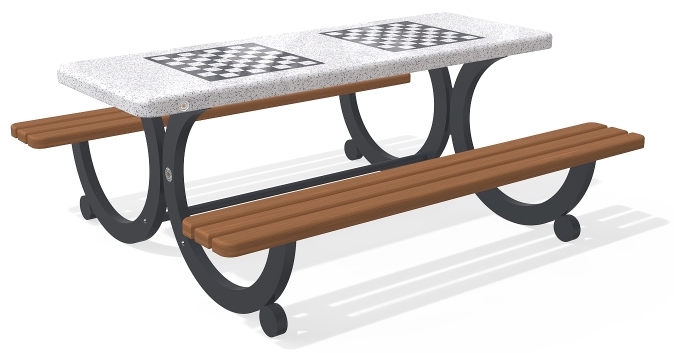 Il modello EE416 sfrutta un sistema consolidato di produzione che permette di integrare nella superficie in calcestruzzo diversi tabelloni da gioco. Oltre alle classiche scacchiere e backgammon, si può riprodurre lo schema del mulino (o tela, filetto) e la tavola multicolore del sempre divertente Non t’arrabbiare (Ludo, o dama cinese). Anche in questo caso resta disponibile tutta la gamma colori degli altri modelli di tavoli con le curve.