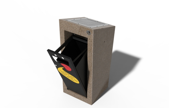 Il cestino parlante è costruito utilizzando i più pregiati materiali. La struttura è in calcestruzzo ad alte prestazioni (classe di resistenza C60/75), disponibile nei quattro colori standard. La superficie è levigata e rivestita con uno strato di vernici poliuretaniche trasparenti che esaltano la resistenza del materiale e gli conferiscono l’aspetto del marmo. Lo sportello basculante, che libera l’anello superiore con funzione di reggi-sacco, è in acciaio inossidabile AISI430 verniciato a polveri in colore nero. L’apertura della porta è regolata da una serratura di sicurezza a chiave universale.