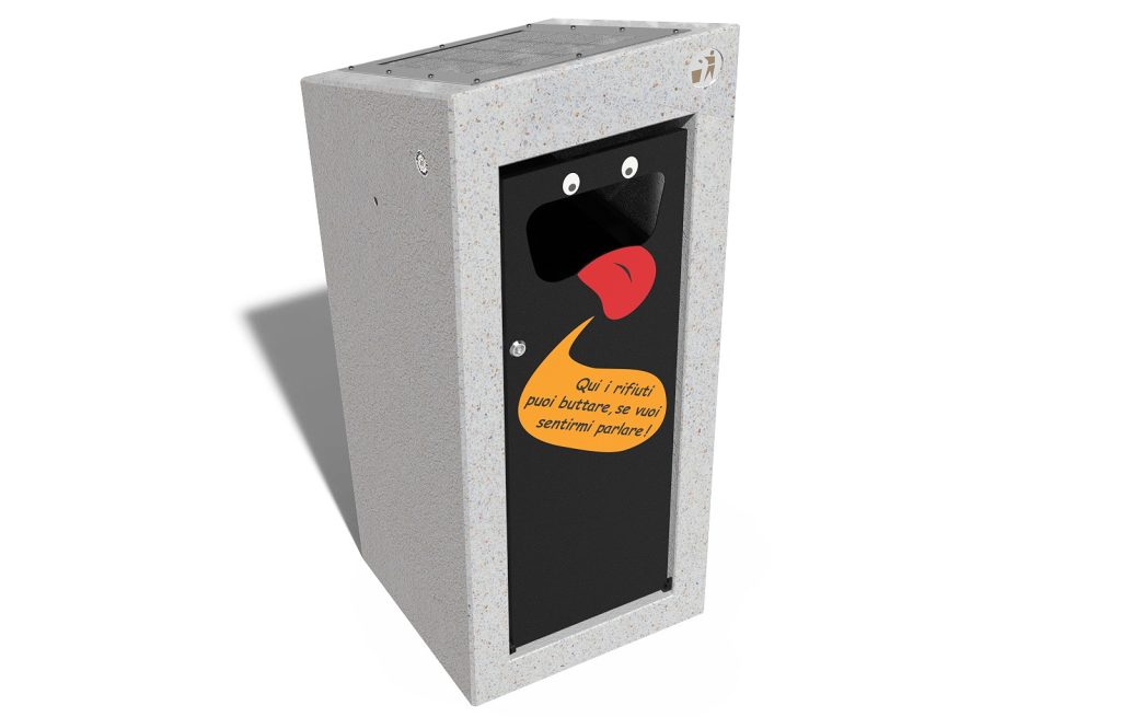 L’invito riprodotto sullo sportello metallico anteriore, d’altronde è piuttosto esplicito: “Qui i rifiuti puoi buttare, se vuoi sentirmi parlare!”. Così recita il fumetto pronunciato dalla “bocca” di conferimento dell’immondizia. Dotato di un sensore di movimento e di un dispositivo vocale, il cestino reagisce quando i rifiuti vengono gettati riproducendo frasi personalizzate o messaggi pre-impostati. Questa funzione mira a motivare le persone, in modo divertente, a gettare i rifiuti nei luoghi corretti. Un piccolo contributo alla protezione dell’ambiente per le generazioni future.