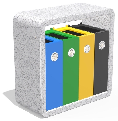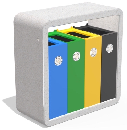 I quattro cestini sono in acciaio. Il metallo è zincato, per essere protetto dalla corrosione, e verniciato a polveri di poliestere termoindurenti per attribuire una colorazione permanente ed uniforme che permetta la corretta individuazione e separazione dei rifiuti da gettare. Come ulteriore indicazione, sul corpo di ogni cestino sono riportate apposite scritte con indicazione del contenuto. Il movimento basculante dei quattro contenitori consente di liberare la cornice protettiva superiore e di poter eseguire le operazioni di sostituzione dei sacchetti. Il movimento di inclinazione può essere bloccato agendo su una serratura di sicurezza a chiave universale, per ridurre le possibilità di accessi non desiderati.