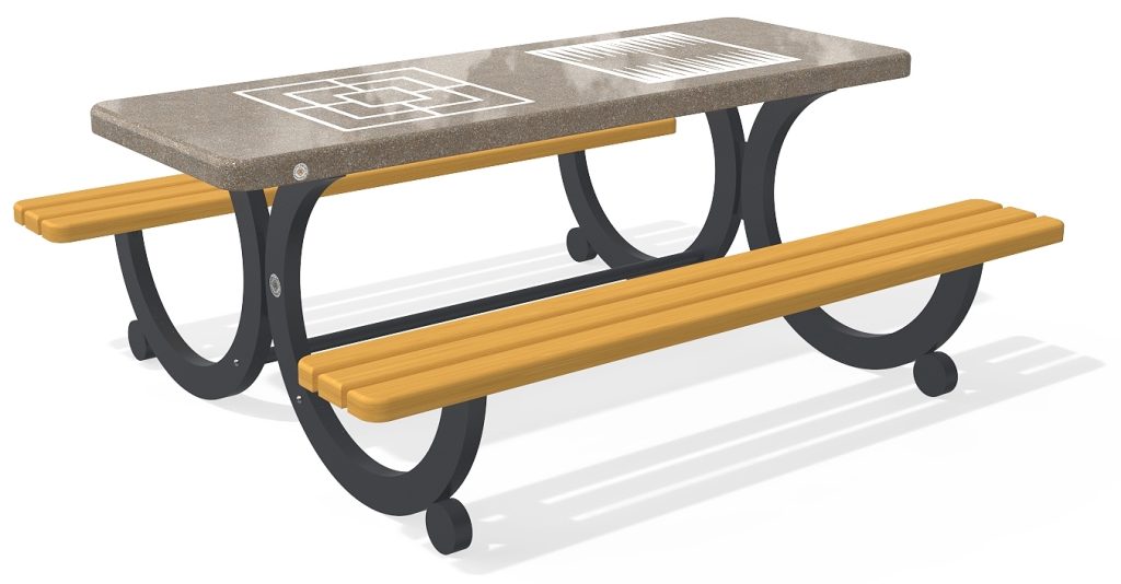 Il modello EE416 sfrutta un sistema consolidato di produzione che permette di integrare nella superficie in calcestruzzo diversi tabelloni da gioco. Oltre alle classiche scacchiere e backgammon, si può riprodurre lo schema del mulino (o tela, filetto) e la tavola multicolore del sempre divertente Non t’arrabbiare (Ludo, o dama cinese). Anche in questo caso resta disponibile tutta la gamma colori degli altri modelli di tavoli con le curve.